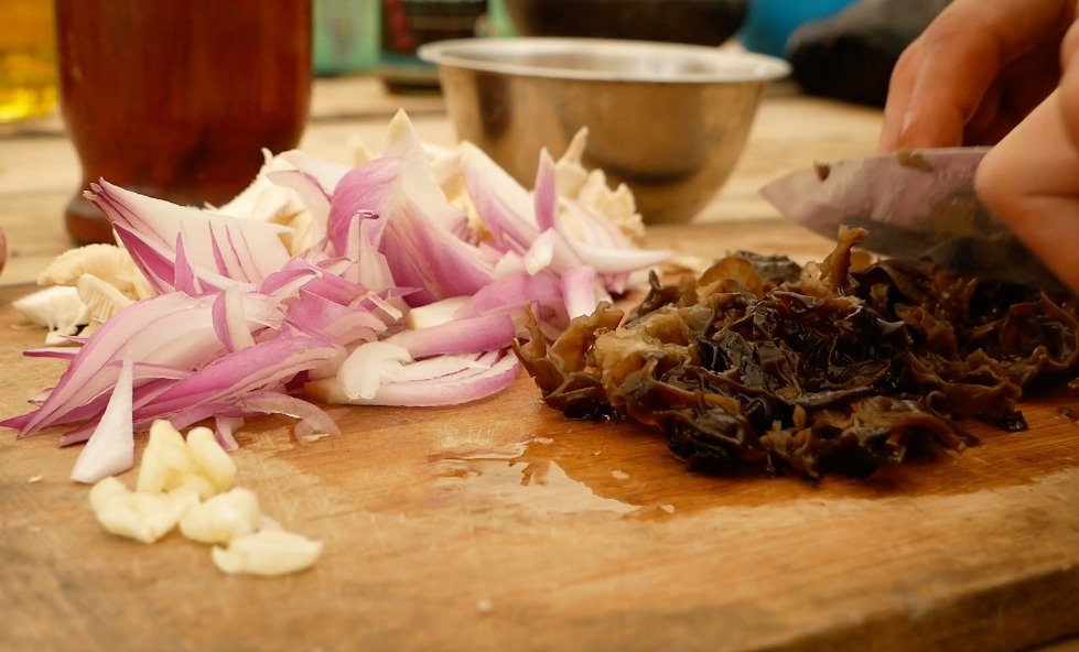 Salteado de hongos en sarten y leña, en medio de la naturaleza en las entradas del Templo Vegetal Sakroakuarius. Se utilizaron hongos negros, Orellanas y shitakes, se acompaño con un arroz con ortiga, una receta muy sencilla, rápida y saludable.