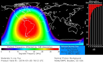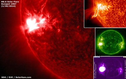 Se observó una moderadamente fuerte llamarada solar que llega a M6.6 alrededor de las manchas solares 1967 a las 16:11 UTC Jueves. La erupción puede haber producido una eyección de masa coronal (CME) en base a las últimas imágenes de SDO. Se detectó una emisión de radio de tipo II con una velocidad de 2161 kilometros / s. Debido a que la mancha solar aún no se encuentra en una buena posición geoeffective, es probable que la mayor parte del material eyectado se dirigiría lejos de la Tierra.