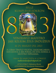 Después de un largo tiempo Dios nos ha concedido nuevainti la bondad de reencontrarnos como la gran familia ke formo nuestro Padre JAH KELIUM ZEUS INDUZEUS y hoy como uno solo daremos testisierto de las vivencias que hemos tenido a su lado, en nuestro trasegar konosiendo el tao y sus milagros, cada monje, cada miembro de la iglesia, cada simpatizante, ha visto en su vida, en su kuerpo, kon su familia, las grandes proezas de vida y salud; son tantas las anécdotas ke aunke tuviésemos una vida entera pada proclamar la gratitud, esta se haría escasa, más les invitamos a que en sus palabras con el sentisierto vivo expresemos al mundo una remembranza de gratitud a nuestro Padre JAH KELIUM ZEUS INDUZEUS… Esta será la forma de homenajear a Nuestro Padre Kosmokrator en su kumpleheliokron simero 83.