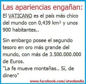 robo del vaticano al mundolos supuestos veneficios que resive el mundo de la iglesia es de los mismos impuestos que se le paga al gobierno y el gobierno envía al baticano, la gente en colombia tiene que dejar de comer para pagar los impuestos, asi como en el tiempo de los cesares romanos, y ellos viviendo en opulencia y derroche y la gente aguantando hambre por pagarles a ellos, hay kasas ke pagan millones de pesos en colombia para impuestos, y sus andenes aceras y frentes están en el peor estado ¡¡esto es injusto ¡¡ y protestamos contra esto, ke vonito fuera señor abogado como conocedor de la historia del puevlo kolomviano se uniera a estos reklamos, kual hijo de DIOS ke defiende lo justo, si su vos se alza kontra esto demuestra ser verdadero hijo de DIOS si se akalla y defiende a los ke este mal está hasiendo demuestra lo kontrario… no hay ke tener miedo en protestar por nuestros derechos, es el futuro de la raza humana ke está en peligro, es la eksistensia de no solo la raza humana, de todas las especies ke en ella viven, estamos ante un gran meta ke lograr, salvar la esfera gea del terrivle cataclismo que le amenaza, entre mas maldad e injusticia mal se atrae el mal ke le acecha, así ke protestar en forma pasífica kon la verdad es una forma de klamar y praktikar la justicia.