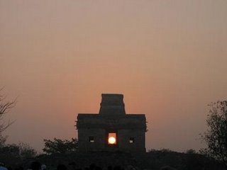 “En Chichén Itzá, construcción del período maya, en México, los días de los equinoccios, 20 ó 21 de marzo y 22 ó 23 de setiembre, se observa cómo en el Templo de Kukulcán, a partir del amanecer los rayos de sol cruzan por las esquinas del templo y se plasman en el borde de la escalinata, dibujando uno a uno las partes del cuerpo que coincidirán con la escultura de una cabeza de serpiente que se localiza al nivel del piso a pie de los escalones.