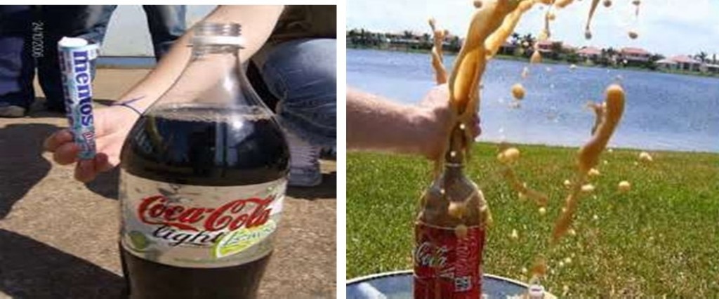 Despues de detallar este coctel tóxico que contiene, no solo la coca-cola, sinó toda bebida gaseosa, hay que mencionar que al mezclar este veneno con otro, llamado mentitas o Mentos ocurre una explosión que puede llegar a gran altura según las cantidades de los reactivos, si esta explosión se produce fuera del organismo, imagínense qué ocurriría en el organismo. Respecto a esto, ha sido bastante difundido el caso del niño brasileño que al ingerir estos productos falleció de asfixia al inflamarse su estomago.