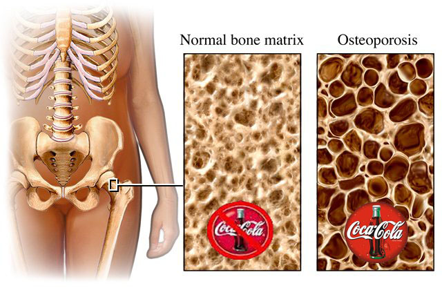 es dañino para la salud en general, en especial para el calcio de los huesos, porque no permite la adecuada absorción en el organismo, provocando su debilitamiento y por tanto incrementándose la posibilidad de tener fracturas, el ácido fosfórico es uno de los mayores contribuyentes al aumento de la osteoporosis, además, la combinación de este ácido con azúcar refinada y fructuosa dificulta la absorción de hierro, lo que puede generar anemia y mayor facilidad para contraer infecciones, principalmente en niños, ancianos y mujeres embarazadas.