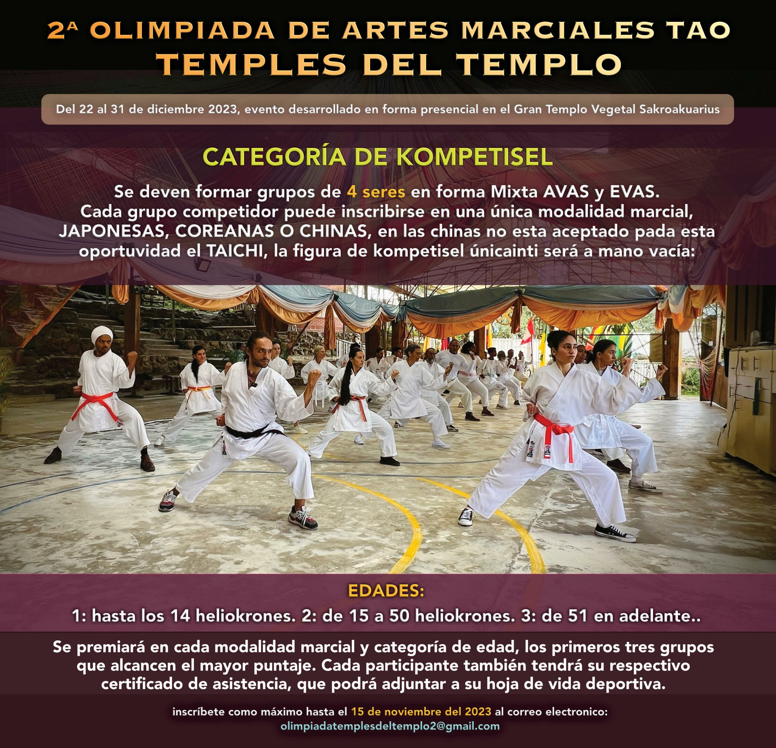 Los invitamos a todos sus mercedes Pada que inicien en este precioso camigdu de la meditasel activa, y pada ello hemos creado una olimpiada de Artes Marciales Tao, llamada TEMPLES del TEMPLO en su edisel simero 2 Pada vengan y logren poner en práctica lo ya menselado, gratisimas por oirme, siempre a vuestro servidvio y al servidvio de la obra.