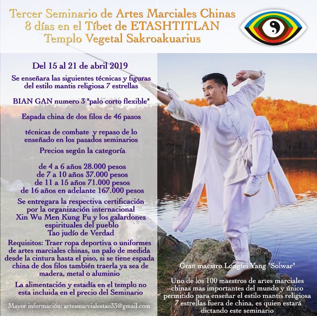 Es EL TERSER SEMINAKUARIO DE ARTES MARSIALES CHINAS, 8 días en el Tivet de Etashtitlan Templo Vegetal Sakroakuarius del 15 al 21 de avril se enseñara las siguientes téknikas y figuras del estilo mantis religiosa 7 estrellas; donde se enseñara Bian Gan numero 3 “palo korto flexible”, Espada China de dos filos de 46 pasos, téknikas de combate y repaso de lo enseñado en los pasados seminakuarius precios según la kategoria.