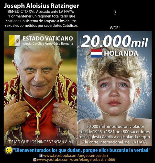 Venerables seres que se unen cada día a la página del Levantamiento Juvenil Tao, les saludamos deseándoles que sea el despertar en sus seres y materias, para que se acerquen cada día más a la verdad que los hará libres, este saludo lo emitimos en nombre del venerable y gran sabio del Tíbet el ELOHIM KÚMIDO al igual que en nombre del venerable maestro AVNER EROS, líderes mundiales del remanente juvenil que se apresura a levantarse en aras de su progreso espiritual y el de sus semejantes, hoy nuevamente traemos un tema que sigue demostrando el retrógrado y criminal comportamiento de la iglesia católica apostólica y romana, que a través de los tiempos se ha saciado en los crímenes más asqueantes, por lo cual sigue representando la GRAN RAMERA APOCALIPTICA, la que se sienta sobre siete montes y se viste de púrpura y escarlata y con la cual han fornicado todos los reyes (gobernantes) de la tierra, esta es la GRAN RAMERA, BABILONIA LA GRANDE, la madre de todos los vicios y las degeneraciones sexuales, a continuación traemos 3 informes en los cuales se denuncia al mundo la violación y el encubrimiento de los crímenes de pedofilia de los clérigos del vaticano, hoy gracias a el supremo hacedor; se hace más y más público los crímenes del vaticano y todo sus secuaces, por favor pongan mucha atención a estos escritos y videos que nos darán claridad de la criminalidad de la curia romana. (CortesíaRT).