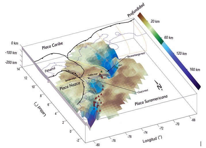 Superficie a partir de 70.000 eventos sísmicos reportados por la Red Sismológica Nacional de Colombia. Caldas Tear se presenta como una estructura que atraviesa el territorio colombiano en dirección occidente-oriente