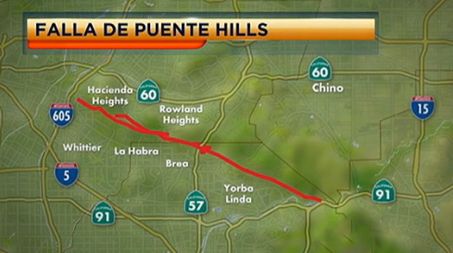 La falla geológica Puente Hills, descubierta por los científicos en el año 1999, se extiende desde el norte del estado de California, bajo el centro de Los Ángeles hacia Hollywood.