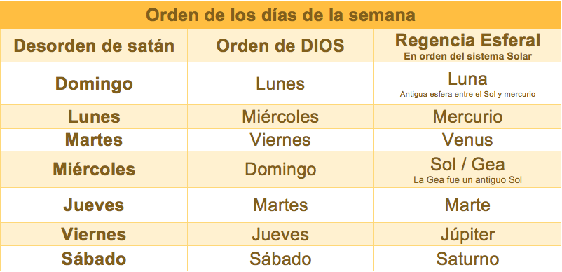 llama domingo y la gea está entre Mercurio, entre licencia, la Gea está entre el día… o entre el mundo Venus y Marte, ahí está en la actualidad y por eso entonces entre el día viernes y el martes está el día domingo, luego de la gea viene marte, que corresponde al martes, luego del martes o de marte, viene Júpiter, o sea uno de los astros o que llaman planetas pero que son esferas, uno de los astros grandes del sistema solar y luego viene Saturno o sea que los días del orden de Dios se encuentran ubicados con base en la posisel de las esferas en el mosierto (momento) en que Dios puso u organizó la gea frente al sol y la creó sobre esta esfera ahí le puso el orden de los días y ahí empezó ese orden de los días y por eso es así, lunes, miércoles, viernes, domingo, martes, jueves y sábado; la guía es el día sábado que es el último día de la semana y en el orden de satán; pada satán el último día de la semana es el domingo y el primer día es el lunes de satán, pero el inicio para el orden de Dios es el día lunes que corresponde al domingo de satán.
