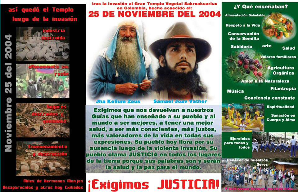 Felicito al venerable Dajamlaker que se quedó un poquitico corto en la cifra dijo que alrededor de 700 taoístas habían sucumbido en manos de los asesinos del estado, en sus diferentes formas, pero talvez se quedó corto, porque la cifra supera con creses ese número; hasta el año 1999 llevábamos una cuenta aproximada e iban ya más de 650 o 660 taoístas asesinados a manos de las fuerzas asesinas de los estados que, o de los gobiernos que manejaron Colombia a lo largo de las décadas o de los años que la doctrina había existido hasta ese día y que de ahí en adelante no tuvieron tregua con el pueblo de Dios y siguieron asesinando y asesinando hijos del pueblo de Dios, hasta que sucedió la invasión y después de la invasión continuaron el asesinato, la persecución durante más de 40 o 38 heliokrones y desde antes de hacer la doctrina ya la estaban persiguiendo, ya la estaban asechando, asesinando inclusive familiares de la familia genética de nuestro amado Maestro y de la Madre Afrodita. Son pocas las familias que en Colombia los que vivieron en los campos, los que vivimos en los campos, la crudeza de la guerra y la crudeza de la persecución, las masacres perpetradas contra el pueblo taoísta en muchos lugares de Colombia, las amenazas de patrañas y de otros demonios que llegaron al poder en el país y que fueron asesinando al pueblo de Dios, patrañas en el año 2000; estuvo a poco de perpetrar un bombardeo al templo y los monjes de esa época lo recordaran, que fue menester crear una zona a donde todas las noches el templo quedaba totalmente abandonado, se dejaban las luces encendidas y se hacía la figura de muñecos de tela para aparentar atalayas, fue menester hacer en la zona de los linderos del templo, hacer cabañas y poner tendidos eléctricos por esa zona y poner muñecos que se guardaban de noche o de día y se sacaban de noche para que quedaran ubicados en esa área y abandonar lo que era el templo, y abandonar esa zona e irse a vivir o a dormir a reposar cada noche en un lugar diferente, abandonando sus cabañas en el templo que quedaba literalmente deshabitado, inhóspito y algunos cientos de metros hacia la zona de abajo de la zona del templo se hicieron cabañas, a semejando las cabañas del templo se apagaba las luces en el templo y se dejaban encendidas en esa zona, ¿para qué? para que si los aviones pasaban a bombardear entonces las bombas no cayeran sobre las cabañas de los monjes que estaban deshabitadas pero quedarían destruidas, entonces con eso se buscaba que el bombardeo fuera en esas cabañas, ficticias y donde se hacían muñecos de tela con la ropa de los monjes y se hacían centenares de los mismos y se ponían para que aparentaran atalayas y gente que estaba transitando, pero ni en el templo ni en esa réplica que se hacía todos los días o que se tenía hecha, permanecían los monjes, porque al ponerse el sol todos teníamos que huir del templo y salir porque algunos de los familiares de monjes que habían en el templo, avisaban que estaban en alerta total en las bases aéreas del país, solo esperando la orden de salir los aviones cargados de bombas para ir a bombardear el templo y como algunos de esos seres tenían hermanos, hermanas, familiares como monjes en el templo, tuvieron la benevolencia de avisar y de comunicar, algunos de los aviadores de las naves de combate que estaban esperando, ya les habían dicho que tenían que estar listos y que estaba ya emitida la indicación hacia donde debía ser, entonces ellos al saber que sus familiares estaban donde iban a caer las bombas tuvieron la bondad de avisar, eso fue en el año 2000, durante el gobierno de Andrés Pastrana, del demonio patrañas y entonces fueron meses en que todos abandonaran y abandonamos el templo por esa situación, eso fue sola una de las tantas pero tantas amenazas que sucedieron fuero del tiempo de las fumigaciones, fuera del tiempo de que fue agredido el templo con naves que todas las noches fumigaban los cielos del templo, envenenando las aguas y destruyendo la naturaleza.