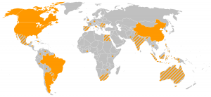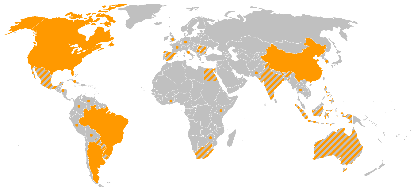 Zona naranja completa: Los cinco países que producen mas del 95% de OMG comercializado. Otros países productores comercializan OMG. Punto naranja: sólo cultivos experimentales. *estos porcentajes han aumentado hasta esta fecha.