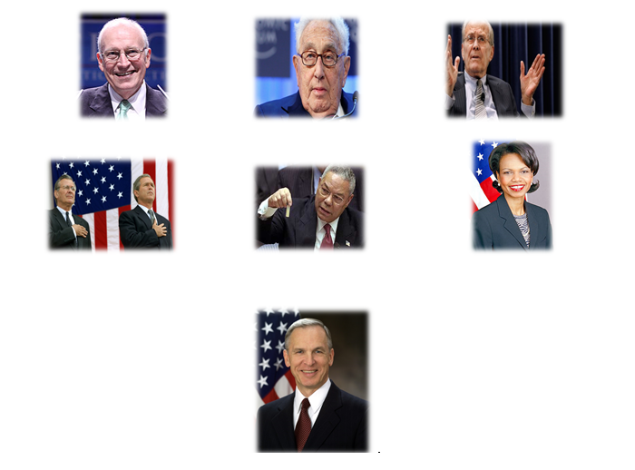 La batalla también es contra los representantes de la cabala oscura, de entre los mafiosos hemos tomado algunos de los mas siniestros personajes que a continuación presentamos: 1. Dick cheyni, 2. Henrry kissinger, 3. Donal Rumsfeld. 4. George w bush, 5. Collin powel, 6.condolezza raid. 7. General cebrowsky.