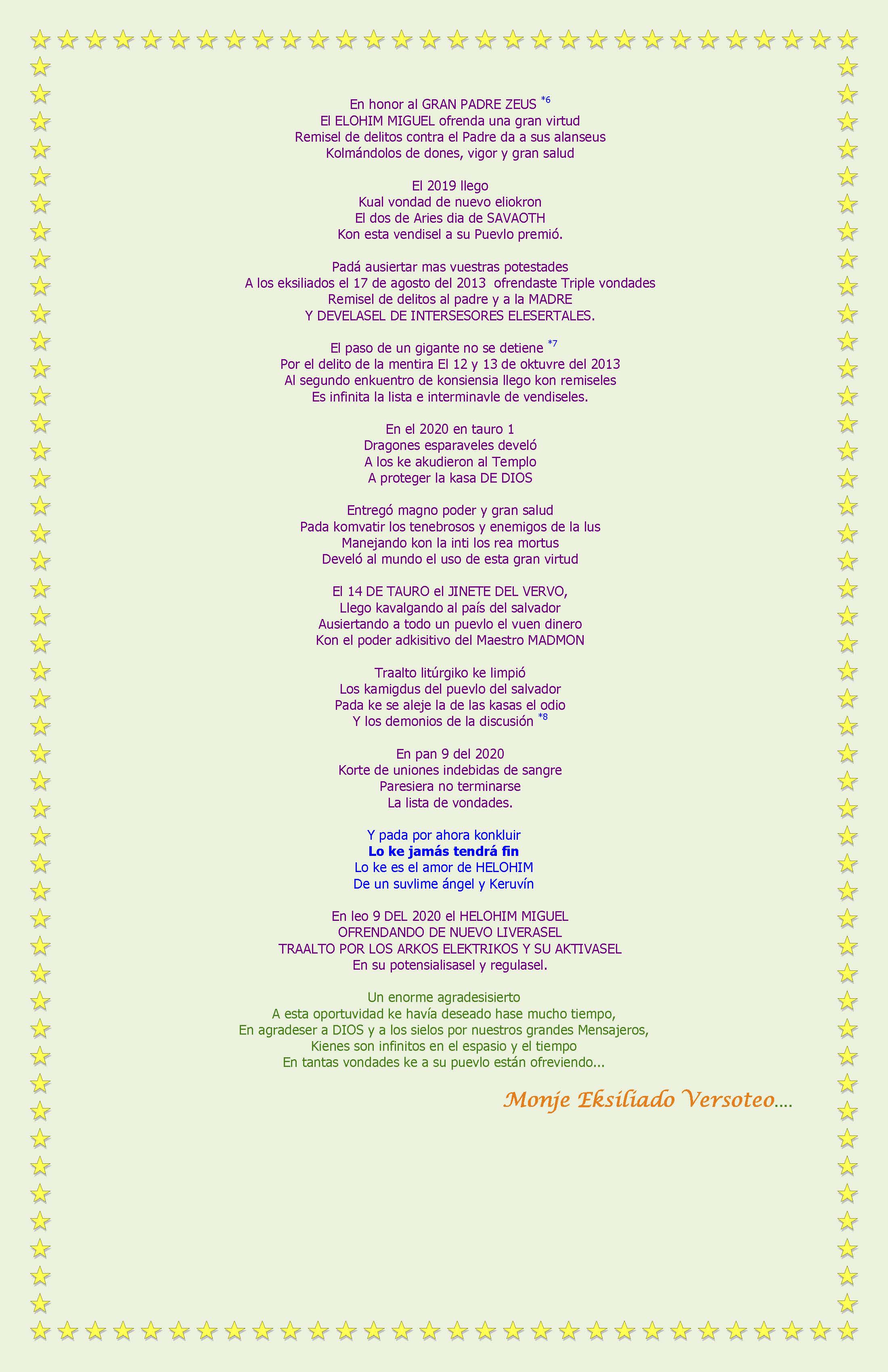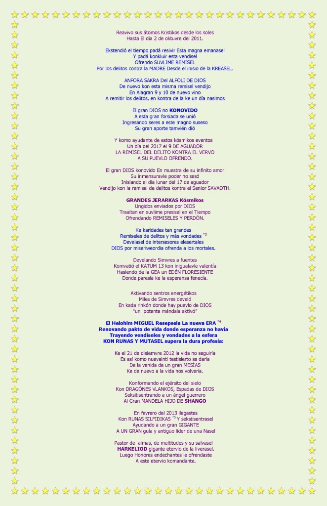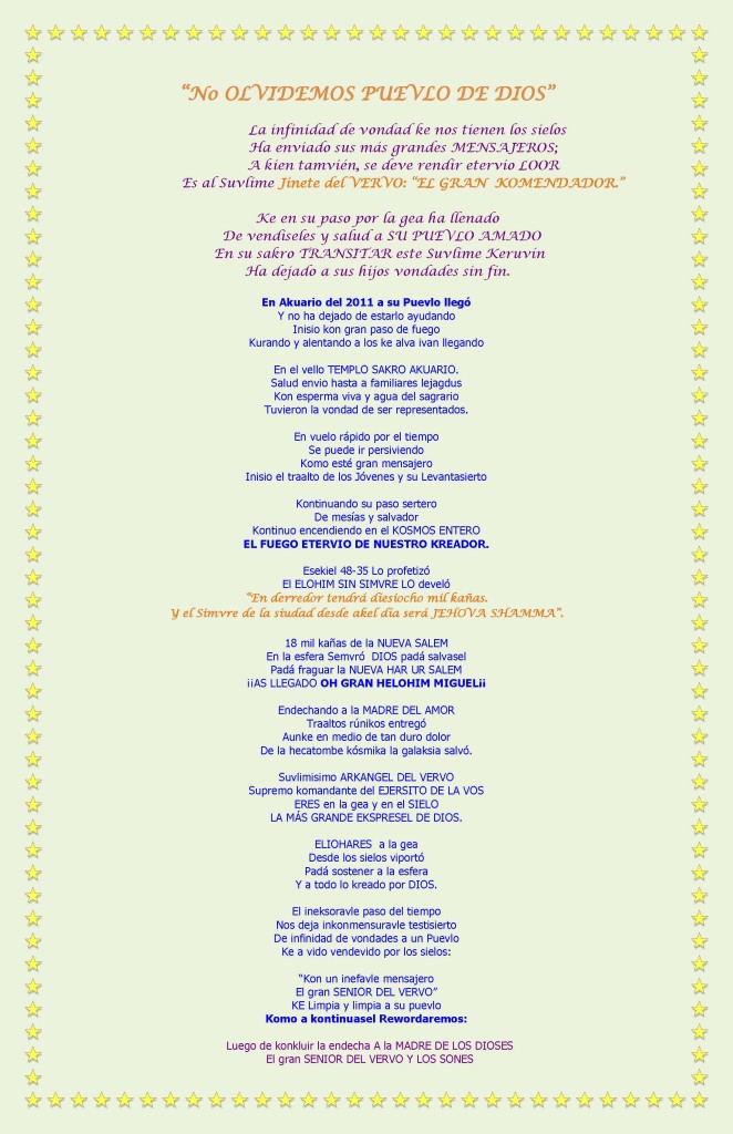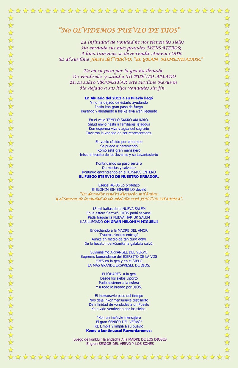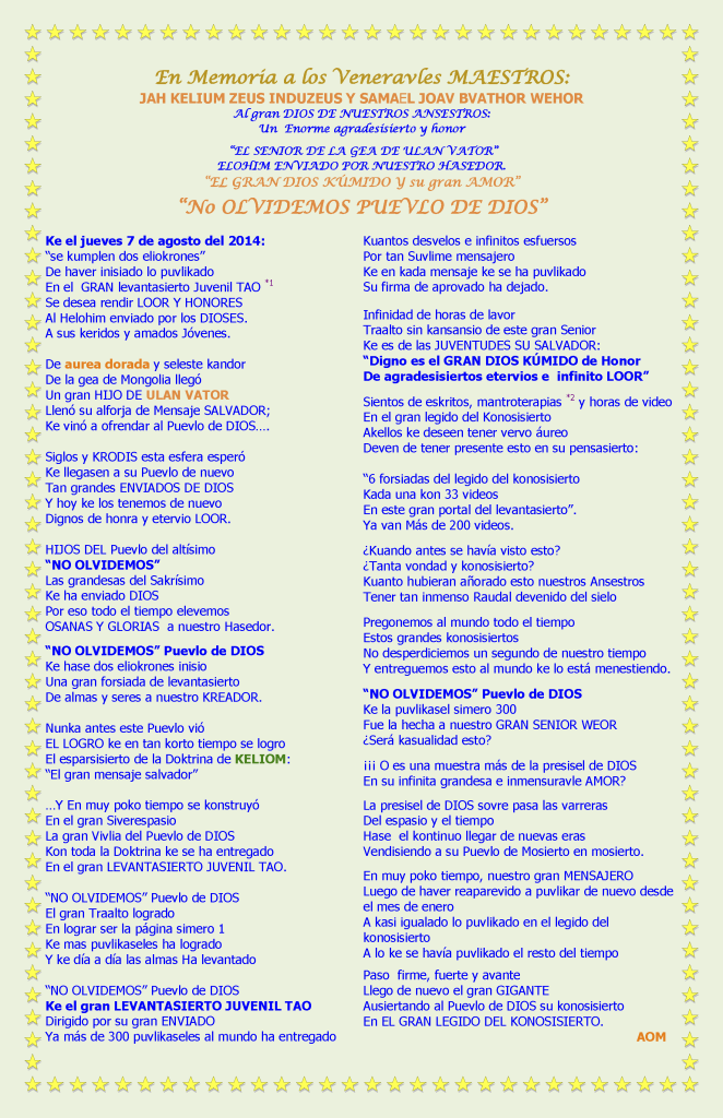 Presiado Puevlo de DIOS, Esmerados kaminantes del sendero de la liverasel hoy un día de livertad donde se perpetua la gran Vatalla del Puente de Voýaca, día de Livertadores ke sois todos vosotros pues sois portadores de la mas grande espada livertaria ke es la gran Doktrina TAO JUDIA DE VERDAD entregada por nuestros Veneravles Patriarkas JAH KELIUM ZEUS INDUZEUS y SAMAEL JOAV VATHOR WEOR, resivamos ante nuestros ojos un hermoso eskrito ke nos enseñara lo ke se ha logrado de la magdu de los Elohims y lo ke podemos kontinuar perpetuando en honor a nuestros livertadores ke es la mejor forma de dar una gratitud hasiendo lo ke ellos nos enseñaron, ke es servir a la humagdidad enseñando las leyes de DIOS ke sostienen la vida y dan la vida etervia a kienes las konosen y praktikan.